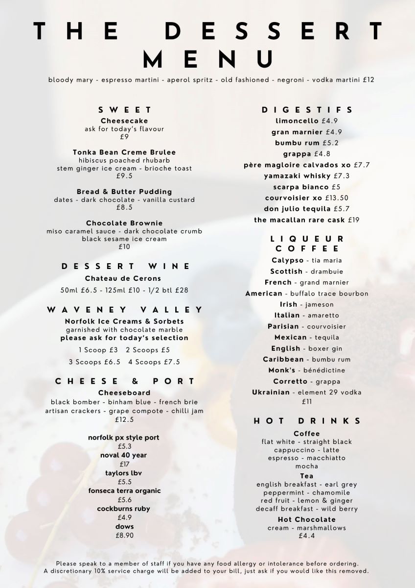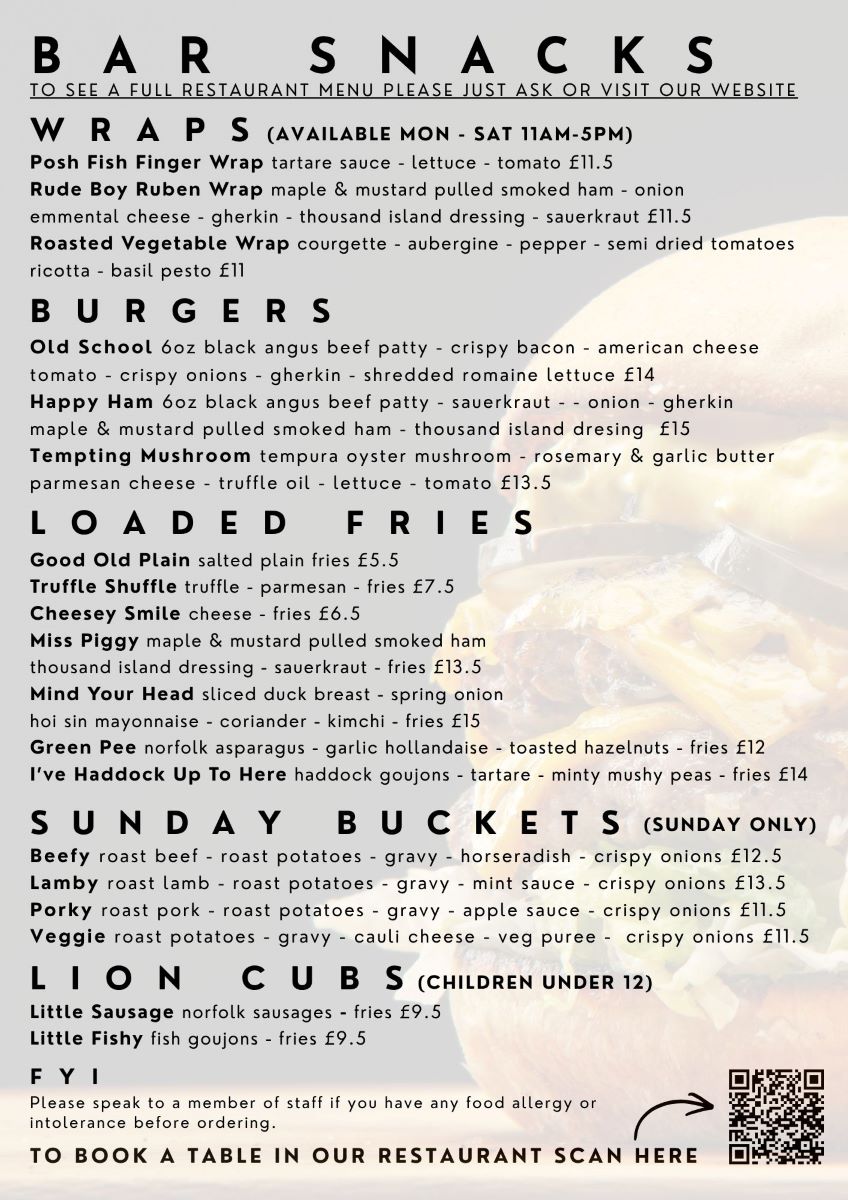 Great Food, Great Drinks, Great Company SAMPLE BREAKFAST MENU SAMPLE SPECIALS MENU SAMPLE MAIN MENU SAMPLE DESSERTS MENU WINE LIST SAMPLE SUNDAY LUNCH MENU SAMPLE BAR SNACKS MENU RESERVE YOUR TABLE TODAY 2026 CHRISTMAS DAY MENU PRIVATE HIRE OF 'THE DEN' Special Offer April 2026 Book a Table at our Restaurant Book Now